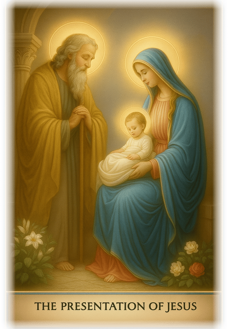 Forty days after the birth of Christ, Mary and Joseph, faithful to the law of Moses, bring the infant Jesus to the Temple in Jerusalem to present Him to the Lord. This quiet act of devotion — steeped in tradition and reverence — reflects their deep humility and obedience to God’s will. In this sacred encounter, the ancient promise meets its fulfillment, and time itself seems to hold its breath.